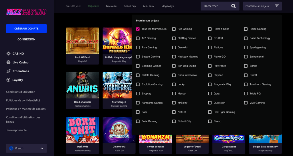 Le cœur d’un casino en ligne, ce sont ses jeux. Sur ce point, Rizz Casino ne déçoit pas. Nous avons analysé son catalogue et y avons trouvé plus de 4 000 titres provenant des meilleurs fournisseurs du secteur. Que vous soyez fan de machines à sous, de jeux de table ou d’expériences immersives, vous trouverez forcément votre bonheur.